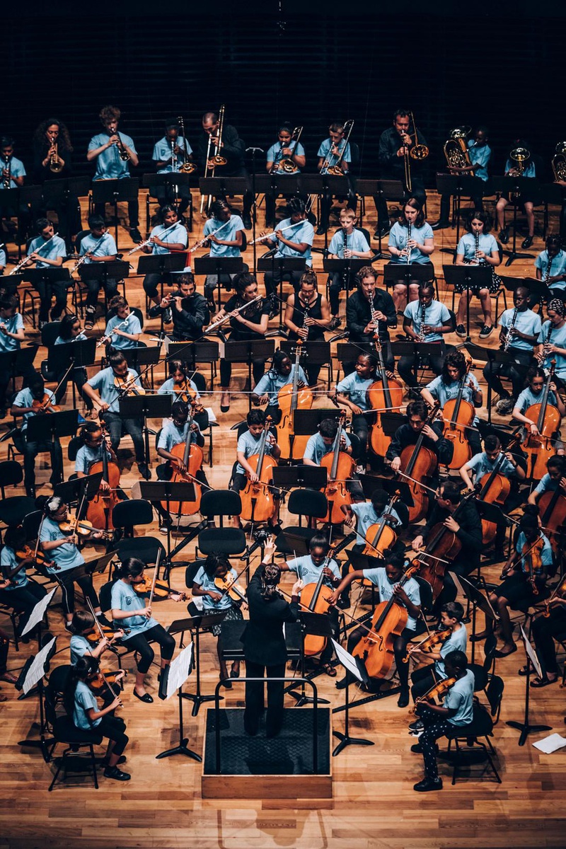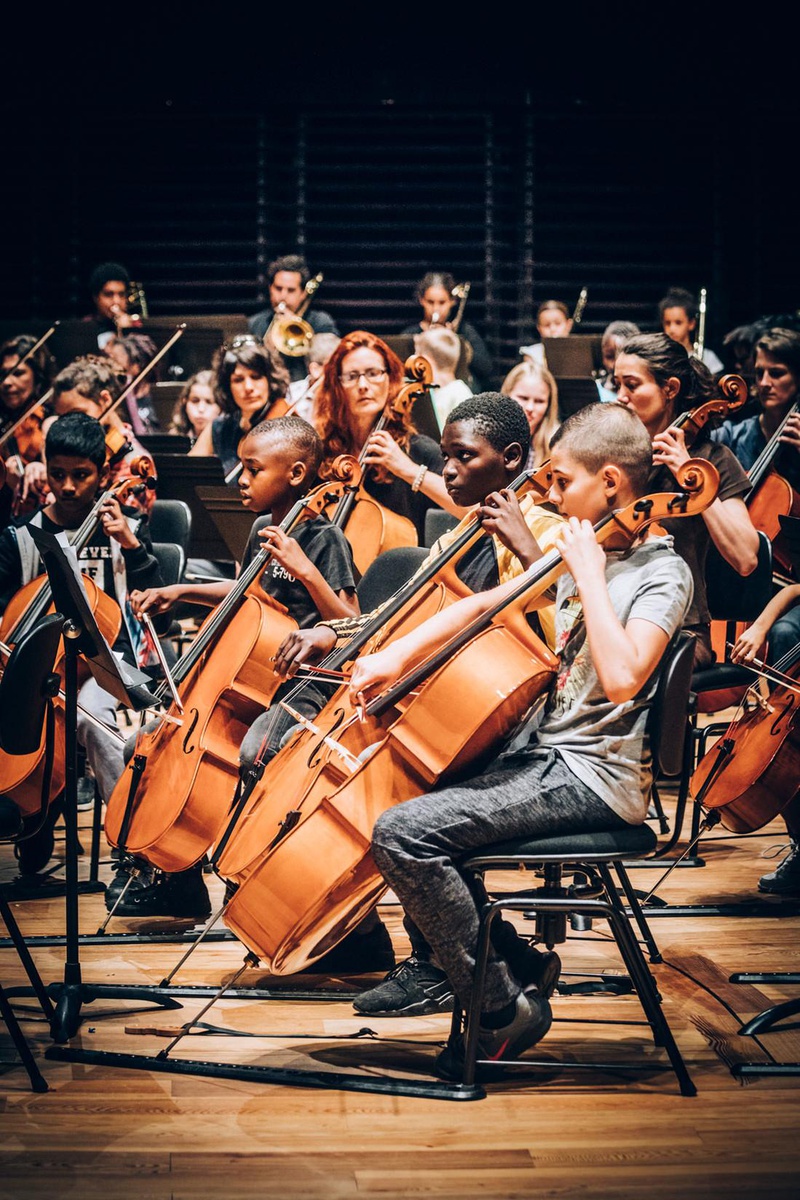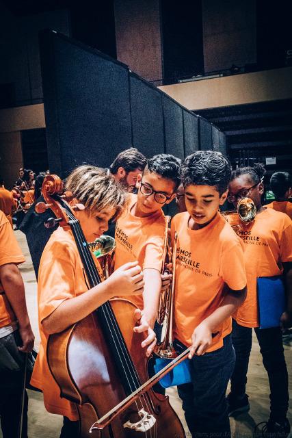 Le projet Démos (Dispositif d’éducation musicale et orchestrale à vocation sociale) rassemble en orchestres symphoniques des enfants de 7 à 12 ans n’ayant jamais pratiqué la musique. Pendant 3 ans, ils se voient confier un instrument pour accompagner leur découverte de la musique. Chaque année, ils se produisent en concert dans la Grande salle Pierre Boulez de la Philharmonie de Paris, et en régions.